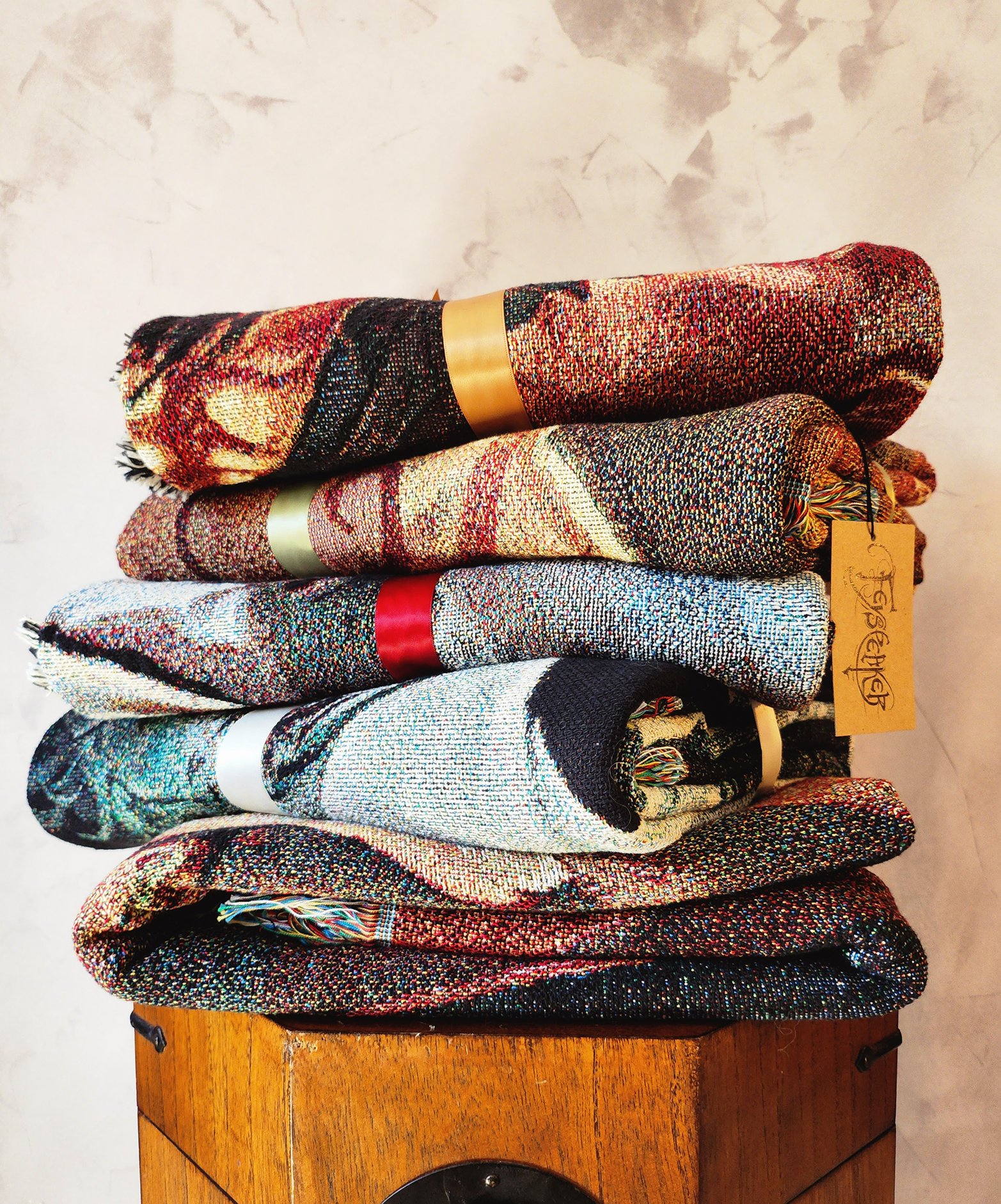 A 72"x54" woven cotton blanket featuring my painting, "Divine." These are quite soft (like a new quality cotton t-shirt) and make wonderful throw blankets, or you can hang them on the wall for display! The design is woven into the fabric, not printed!